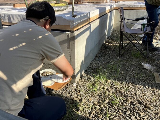 朝、K様にて工事の安全を祈願し、「四方固めの儀」をしていただきました。