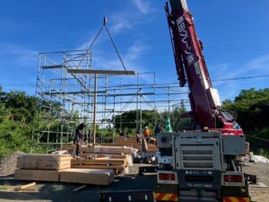 こんにちは!らくらくハウスです。 先日宇土のY様邸にて、快晴の中上棟いたしました。 上棟の日は、クレーン車を稼働し、柱・梁(はり)など主要な木材を組み立て