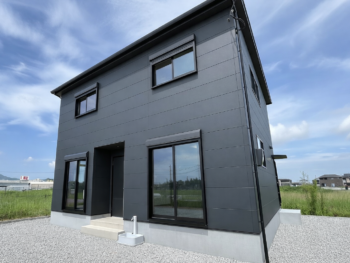 ダークトーンの外壁でまとめた、直線的で無駄のないデザイン。周囲の景色に馴染